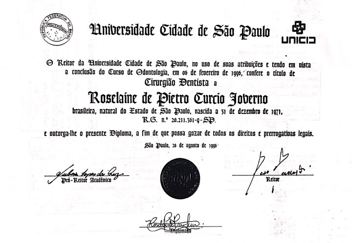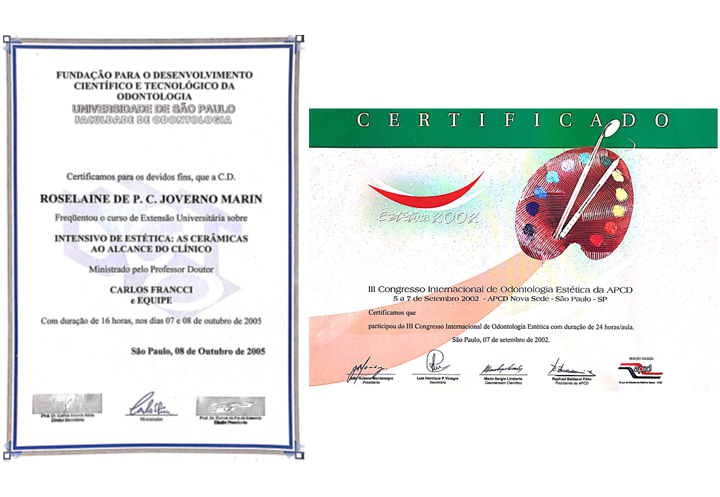Com muita dedicação nos estudos, a curiosidade da Dra. Roselaine continuou presente no seu aprimoramento profissional, onde a mesma incessantemente é obstinada pelas novidades e atualizações tecnológicas da sua profissão, refletida nos inúmeros cursos e pós-graduações presentes em seus anos de profissão, trazendo aos seus pacientes todas as inovações mundiais de equipamentos e software presentes no tratamento odontológico.