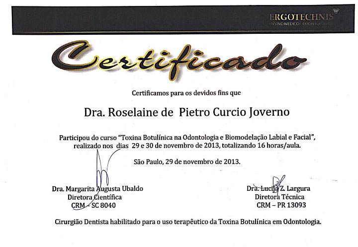 - Habilitação de Toxina Botulínica na Odontologia em Estética e DTM (2013);