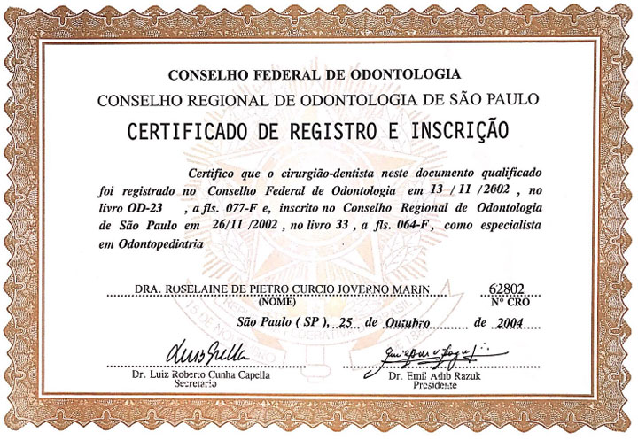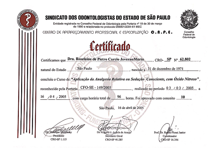 - Habilitação em Aplicação da Analgesia Relativa ou Sedação Consciente com Óxido Nitroso (2005);