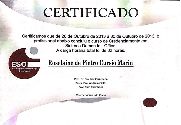 - Curso de Credenciamento em Sistema Damon In-Office na Escola Superior de Odontologia- ESO (2013);